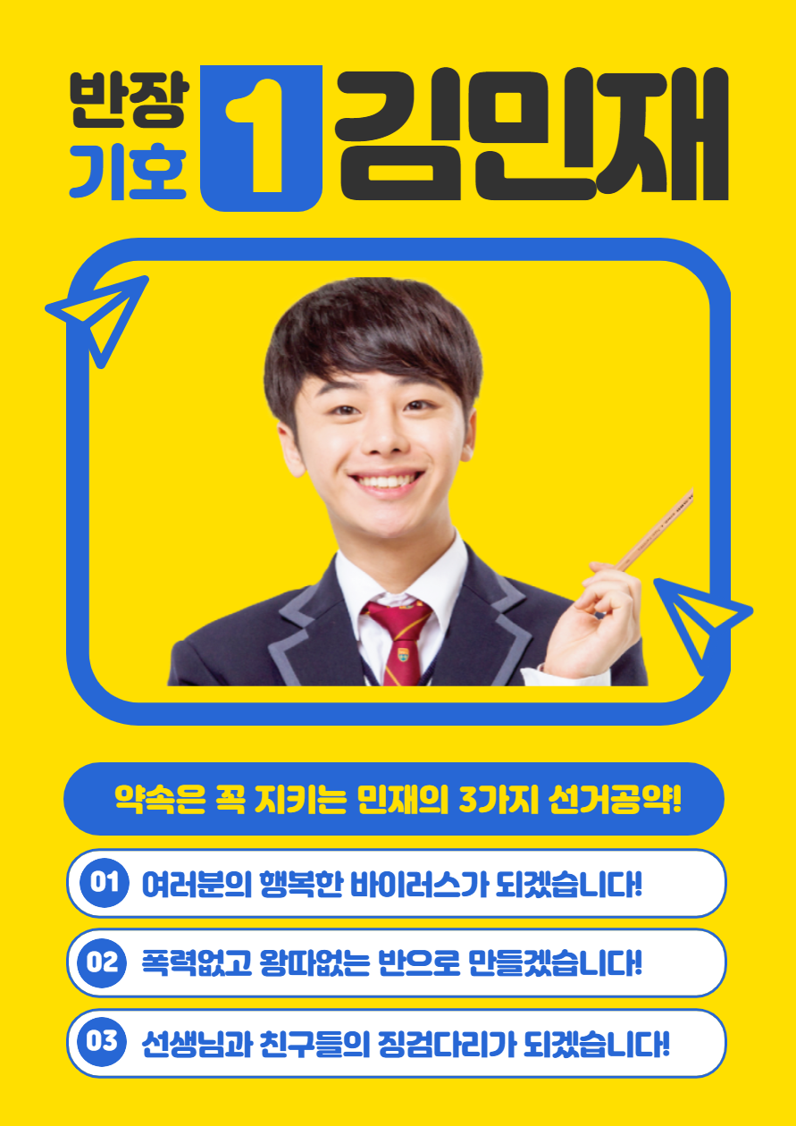 미리캔버스 사이트에서 샘플로 만들어본 반장 공약 포스터 입니다.